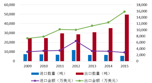 我国近年其他铝合金板、片及带(厚度>0.2mm)进出口情况